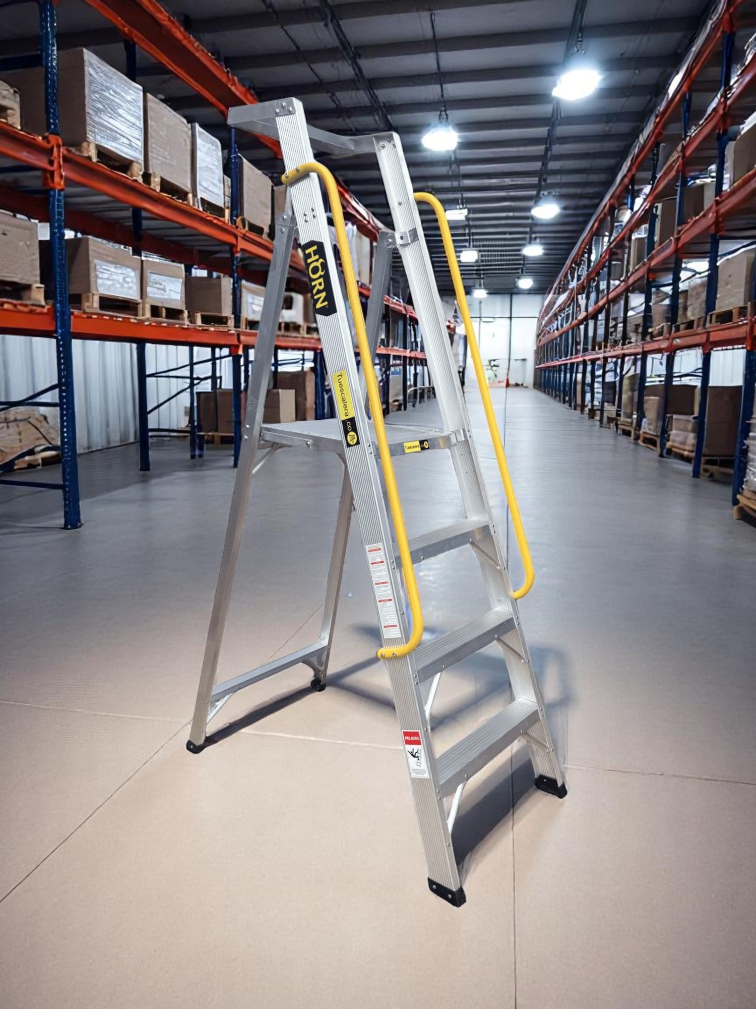 Las escaleras tipo tijera con plataforma en aluminio tienen una capacidad de carga de mas de 300lb, liviana , duradera y diseñada para trabajos exigentes y uso profesional , cuenta con peldaños en aluminio con superficie acanalada antiderrapante, base tipo plataforma en Aluminio que permite un mejor apoyo y maniobrabilidad en su ultimo escalón/plataforma , cuenta con protección tipo confinamiento en tres de las caras de la plataforma para trabajar con alta seguridad, y barandas laterales para ascenso y descenso, zapatas antideslizantes y opción de ruedas con freno de seguridad .Las escaleras de Tijera con plataforma de nuestra linea industrial son sometidas a extensas pruebas de desempeño, según norma ANSI-ASC A14.2-2017 en todos sus numerales, haciéndolas un producto de alta calidad.