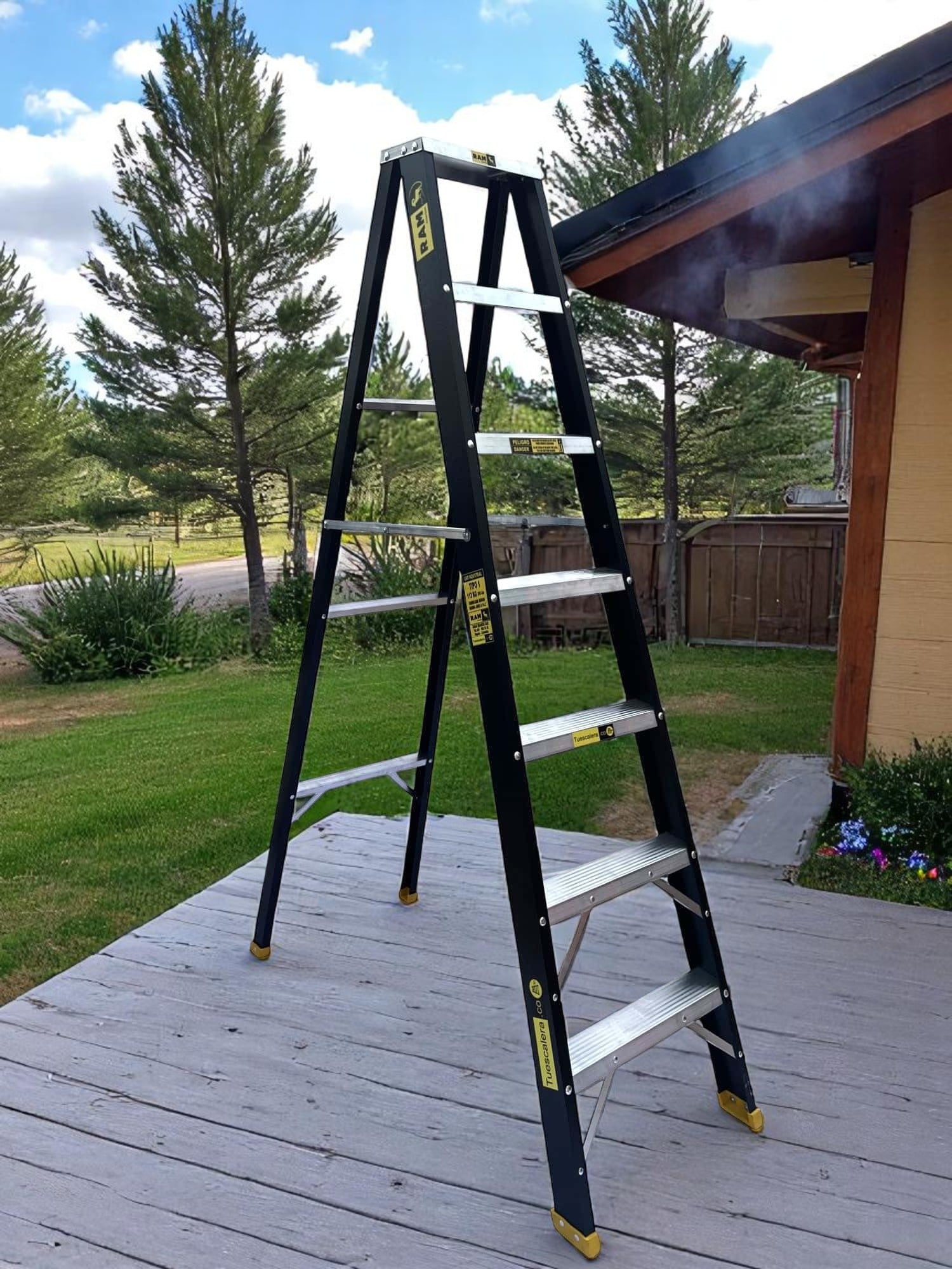 Las Escaleras Tipo Tijera RAM ® en Aluminio están diseñadas para el uso industrial, comercial o domestico tienen alta resistencia mecánica y peso ultra ligero. Perfiles de Aluminio certificado, escalones con superficie acanalada antiderrapante y zapatas antideslizantes , su diseño permite una capacidad de carga de 250 Lbs – 113 Kg , haciéndolas un producto de alta calidad y gran desempeño en múltiples ámbitos excepto trabajos en entornos eléctricos, las escaleras de nuestra línea industrial son fabricadas siguiendo norma Americana ANSI – ASC A 14.2 aplicables a las escaleras de aluminio.